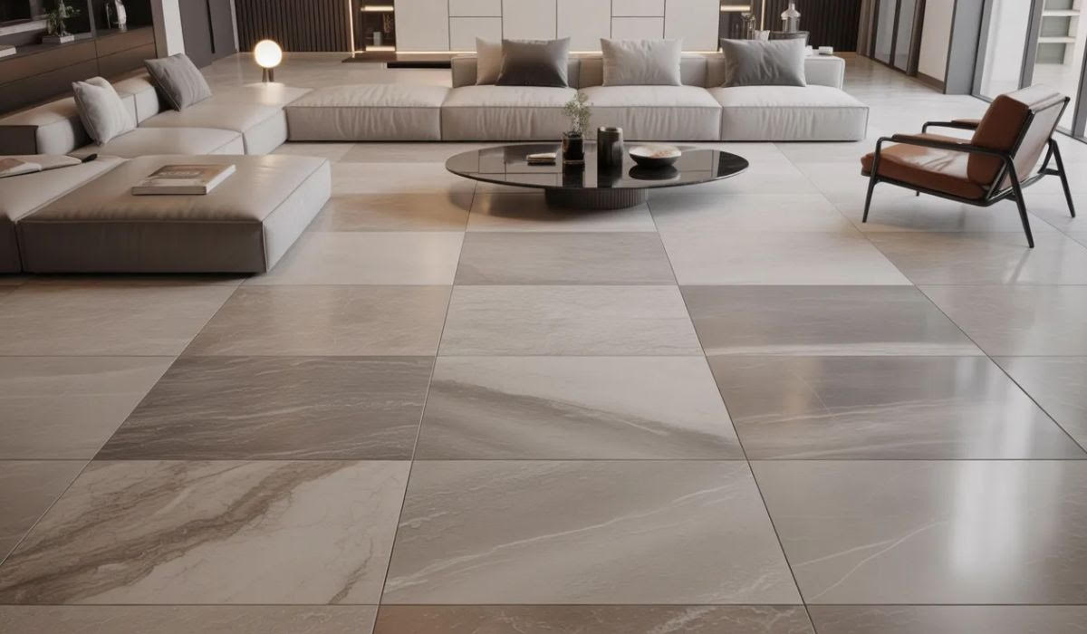 Indoor floor tiles come in virtually any size, from small 300mm x 300mm tiles to large 1200mm x 1200mm tiles, which give the appearance of being seamless with fewer grout lines. Big tiles, such as 1200mm x 1200mm, increase continuity of vision and decrease the time taken to clean.