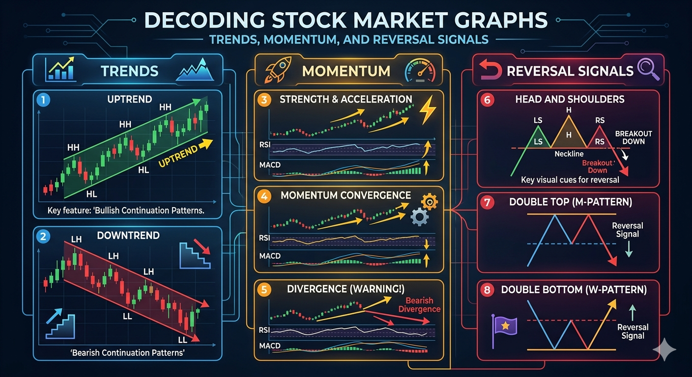 These patterns provide valuable insights into trends, momentum, reversal signals and the key components of stock market graphs, which we will be discussing in this article.