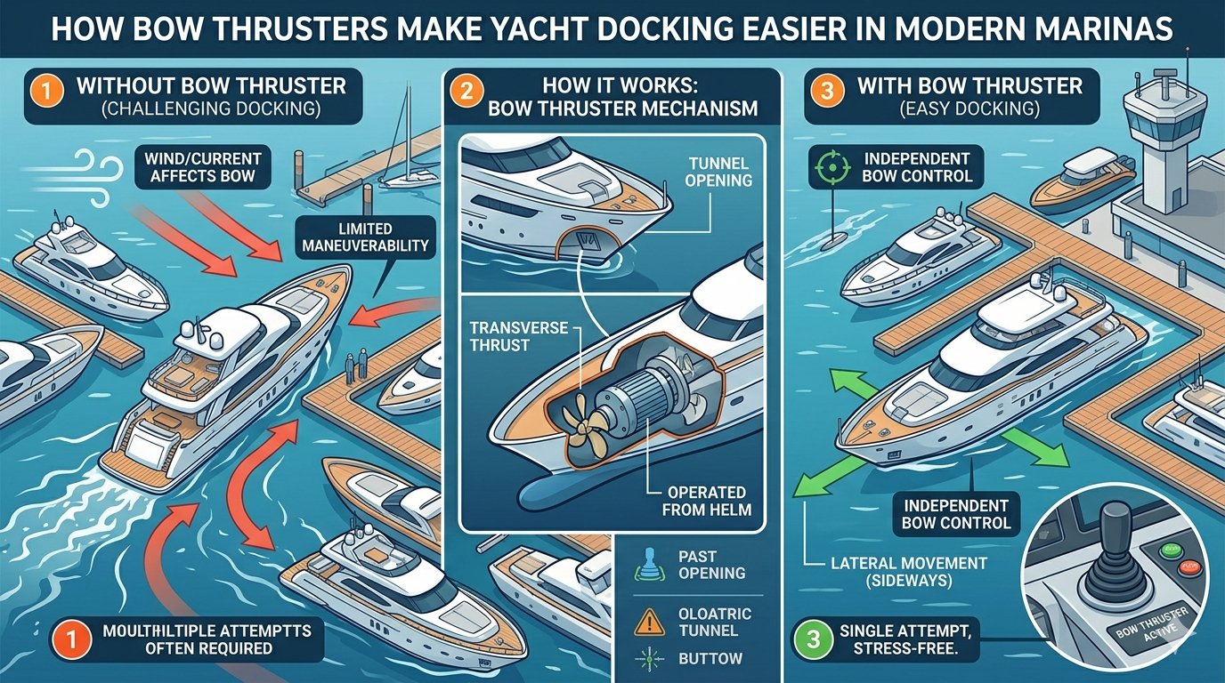 Bow thrusters are especially useful for yachts from approximately 9 to 20 meters, where hull size and windage can make close-quarter handling more demanding.