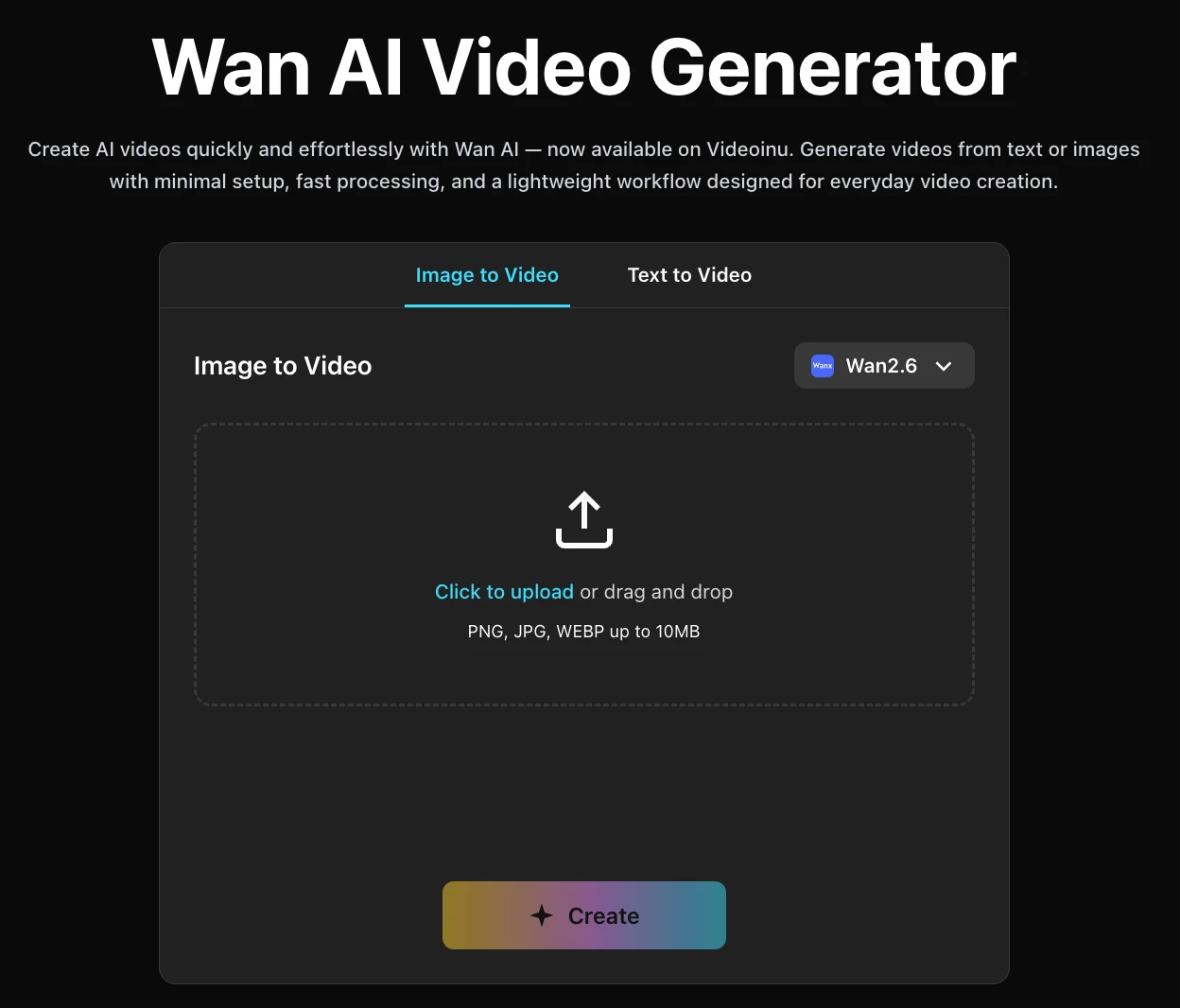 One reason is simplicity. Wan AI fits into the same general creation flow as the other models on Videoinu, so you do not need to learn a separate system just to test it. Another reason is flexibility: Wan 2.6 is surfaced directly in both the text-to-video and image-to-video tools, which makes it easy to move between prompt-first and image-first creation.