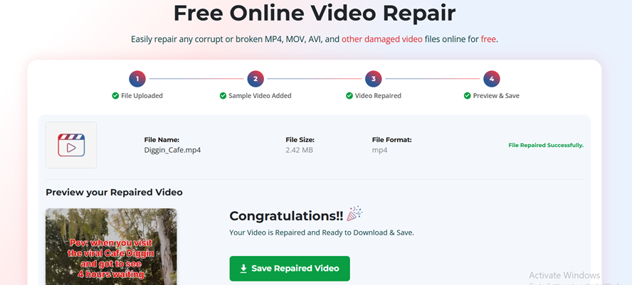 Step 3: Once the repair process is complete, the tool usually provides a preview option. Preview the repaired videos and choose the one you want to save. Click Save Repaired Video to download the fixed video to your device.