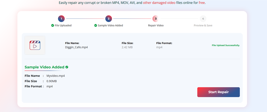 Step 2: After uploading the file, click on the “Start Repair” button to begin the repair process. The software will scan the video for several issues, such as broken or missing file headers, corrupted video frames, and audio-video synchronisation problems.